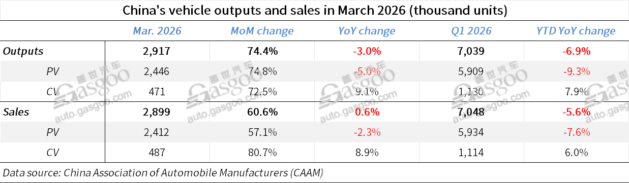 In March, China produced 2.917 million vehicles and sold 2.899 million units, representing month-on-month increases of 74.4% and 60.6%, respectively. On a year-on-year basis, production fell 3% and sales declined 0.6%.