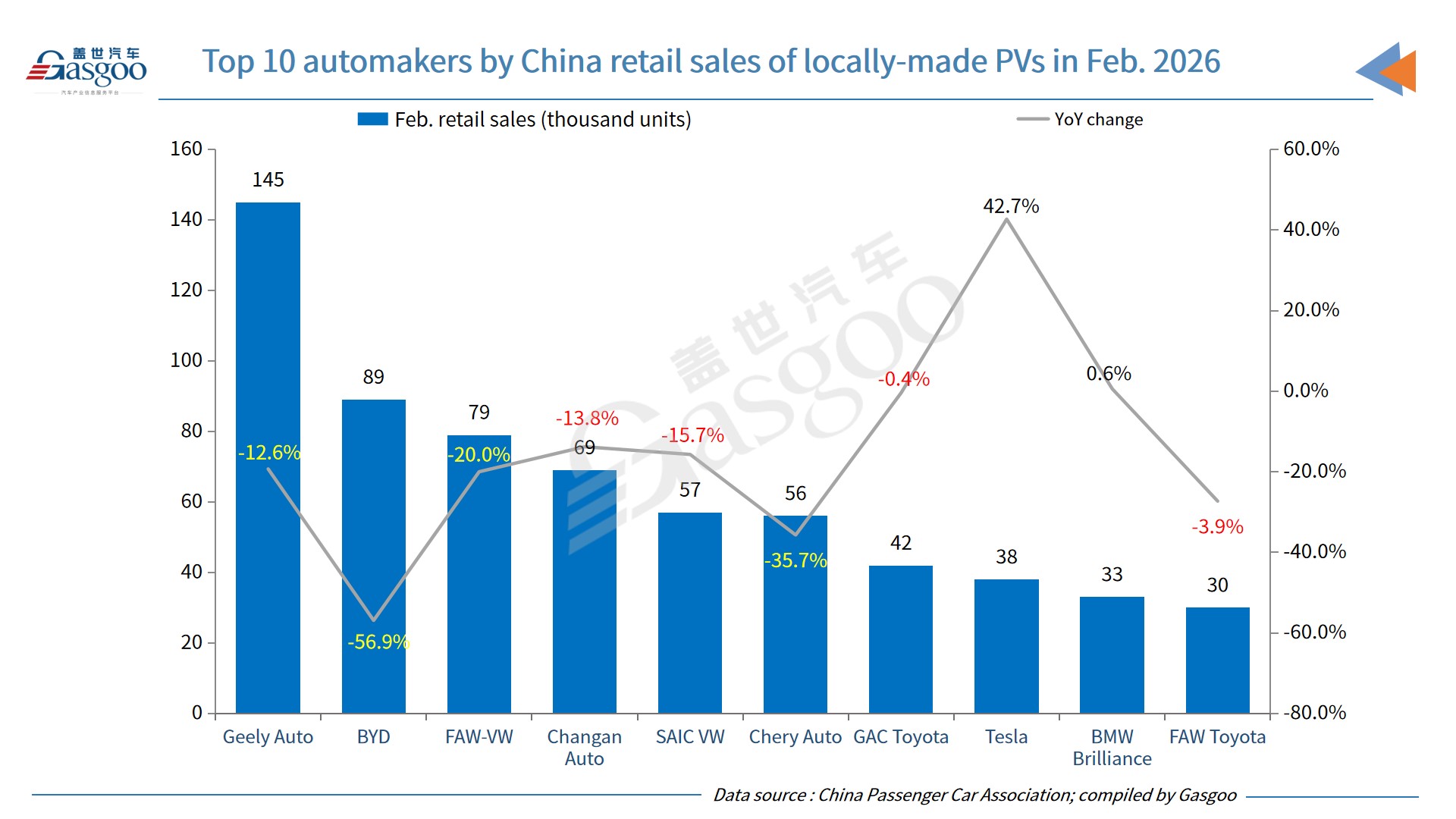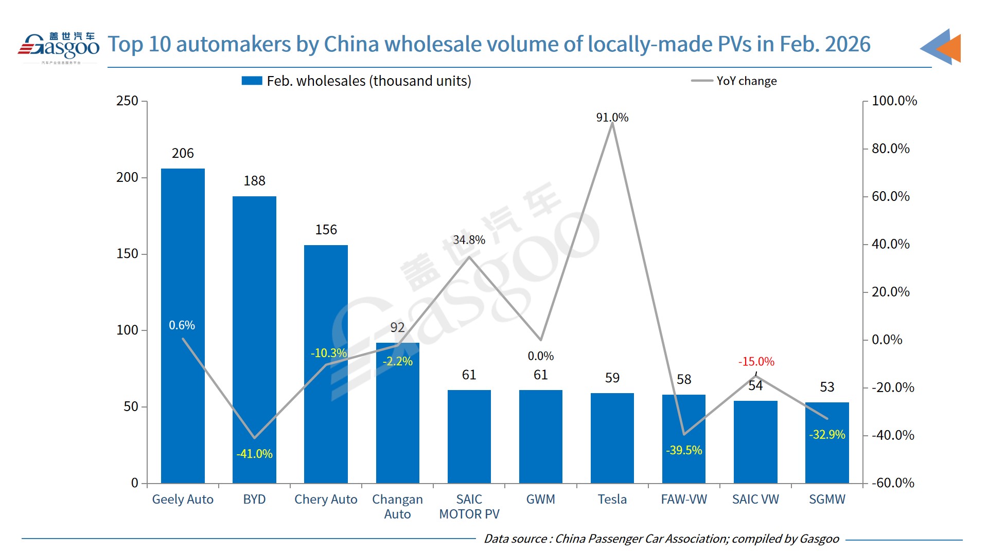 The competitive landscape among major automakers continued to shift in February. Several manufacturers—including Geely Auto, SAIC MOTOR Passenger Vehicle, Tesla, GAC Toyota, Dongfeng Motor, Leapmotor, Li Auto, GAC Trumpchi, NIO, BAIC Passenger Vehicle and Beijing Hyundai—reported year-on-year growth in wholesale volumes.