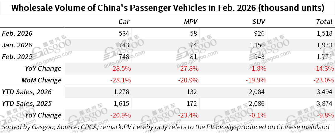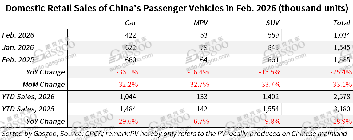 Gasgoo Munich- China's passenger vehicle retail sales totaled 1.034 million units in February, representing a year-on-year decline of 25.4% and a 33.1% drop from the previous month, according to data issued by the China Passenger Car Association ("CPCA").