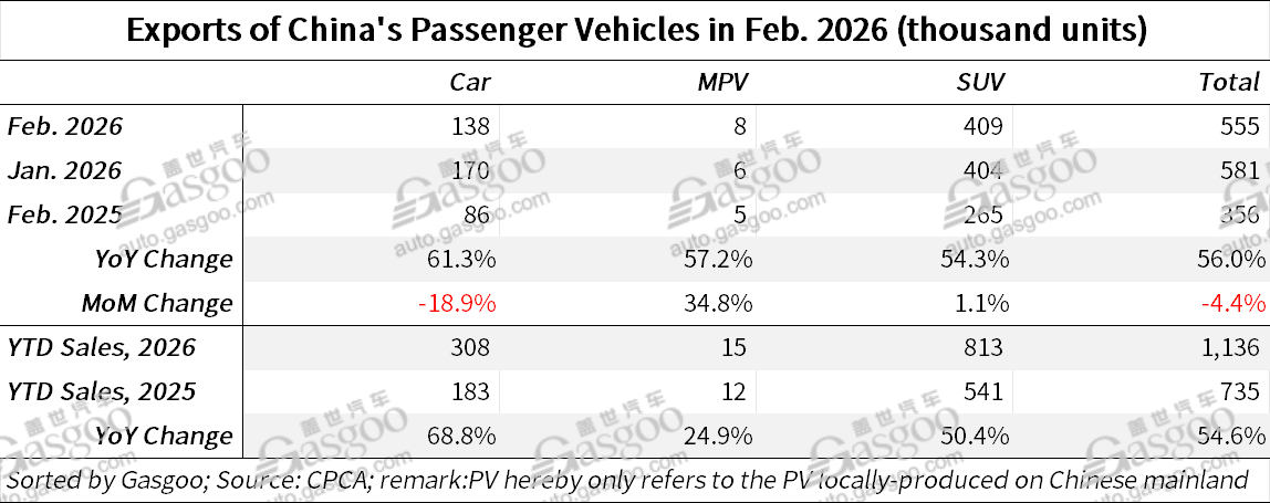 Passenger vehicle exports—including fully built vehicles and CKD shipments—reached 555,000 units in February, marking a 56% year-on-year increase, although the figure slipped 4.4% compared with January.