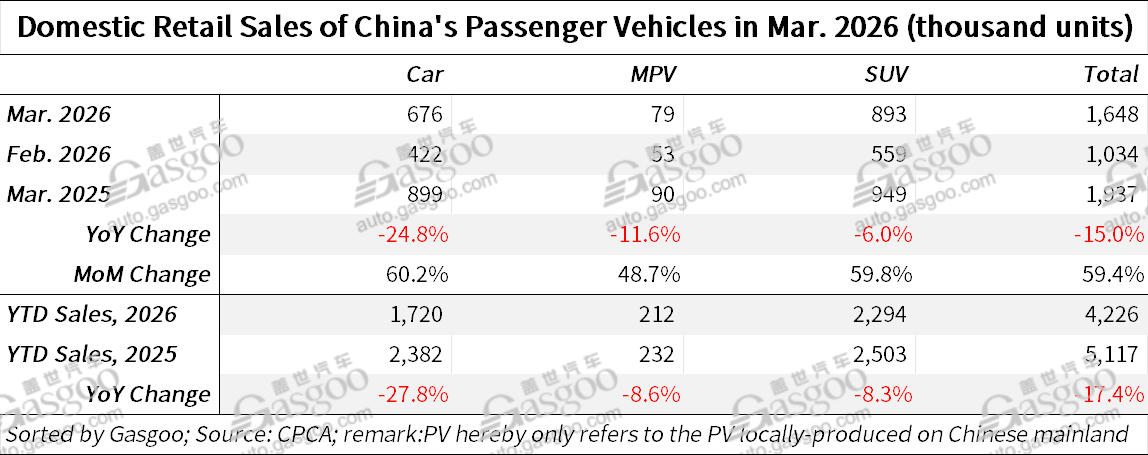 Gasgoo Munich- China's passenger vehicle (PV) market showed a mixed performance in March 2026, with retail sales reaching 1.648 million units, down 15% year-on-year but rebounding 59.4% from February, according to data from the China Passenger Car Association (CPCA).