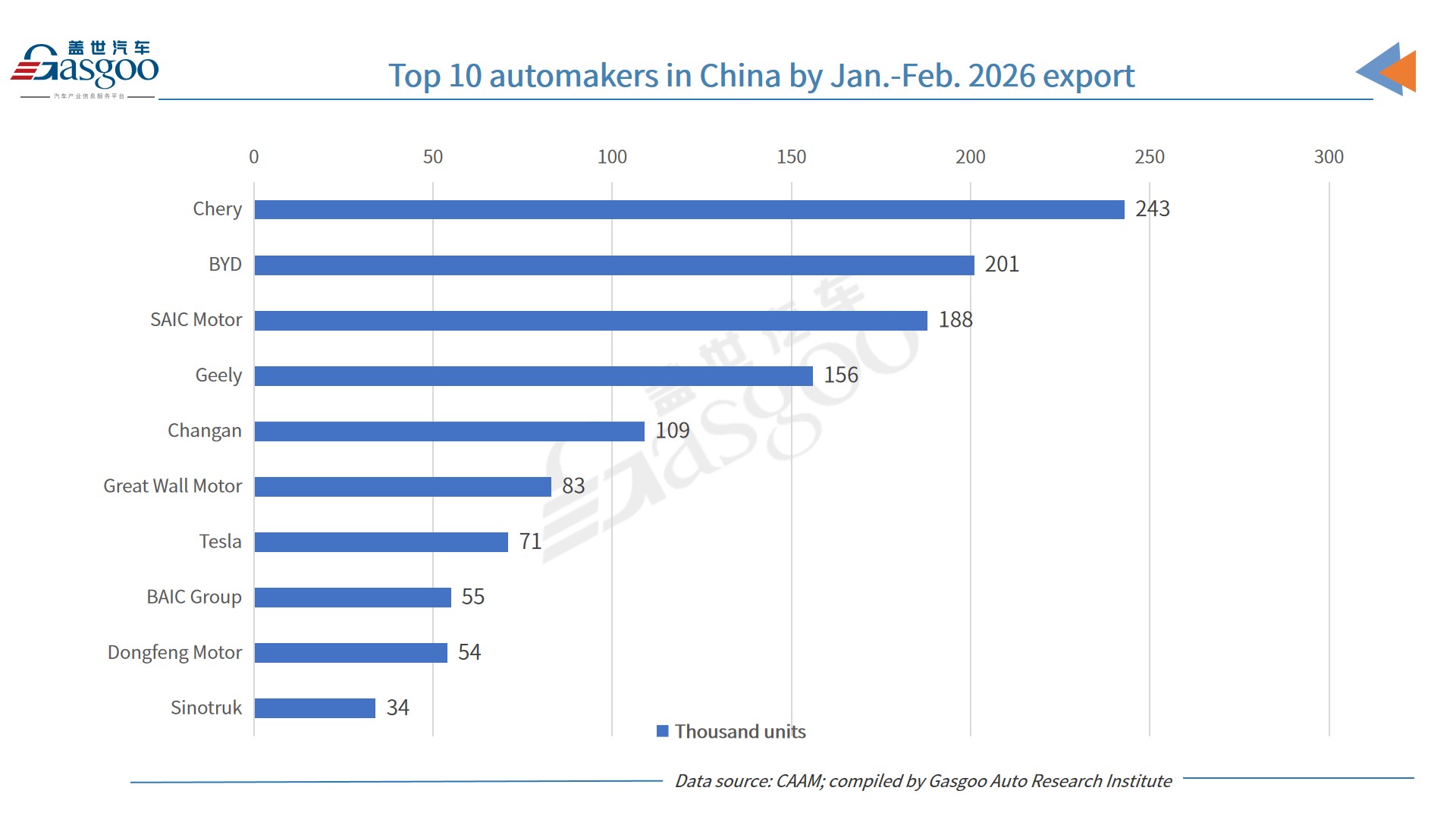 For the January–February period, Chery remained the leading exporter with 243,000 vehicles shipped, representing an increase of 45.6% and about 18% of the country's total exports. Geely recorded the most rapid export expansion among major players during the period, sending 156,000 vehicles overseas, roughly 2.5 times the level of a year earlier.