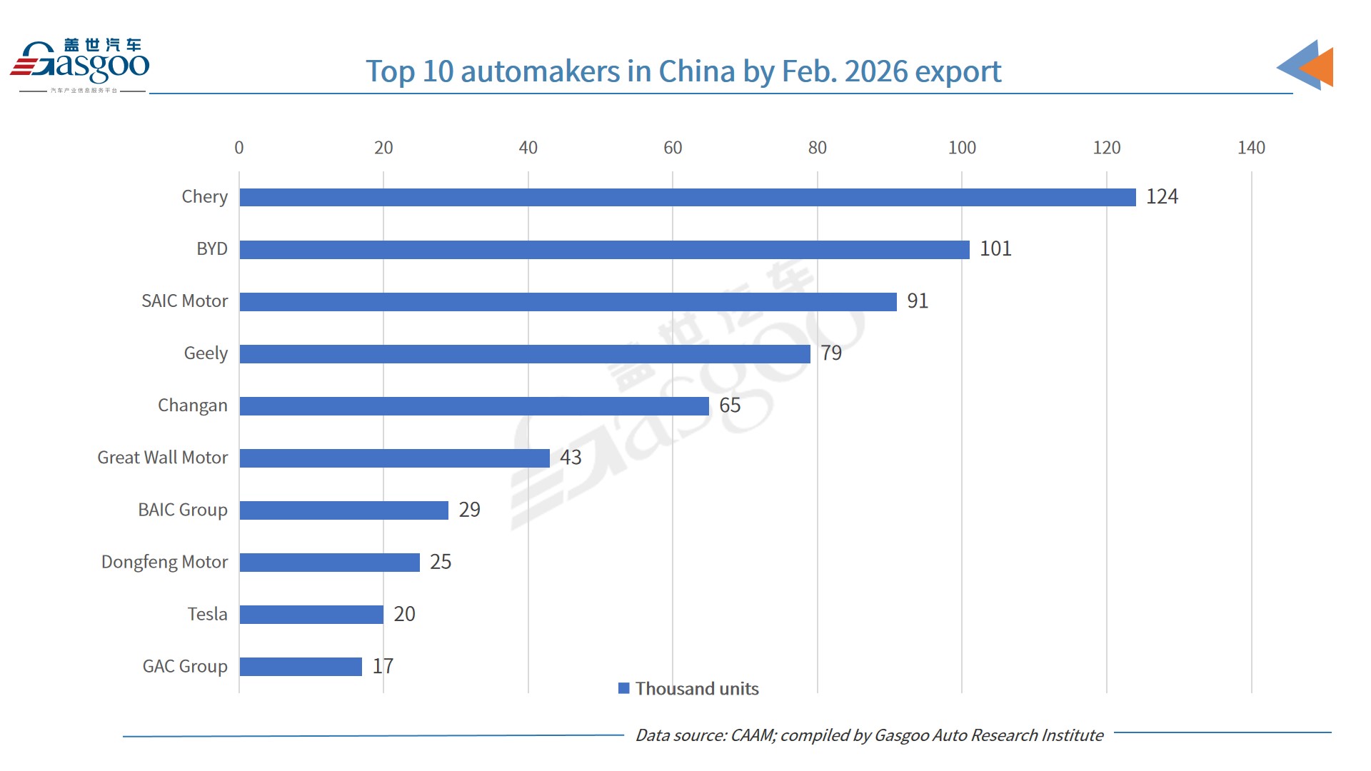 Among the top ten vehicle exporters in February, Chery led the rankings with 124,000 units shipped overseas, up 44.1% year on year and accounting for 18.5% of China's total auto exports for the month. Meanwhile, Tesla posted the fastest export growth rate, delivering about 20,000 vehicles abroad—more than four times its export volume from a year earlier.