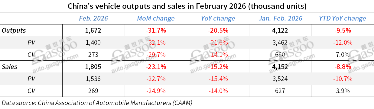 Gasgoo Munich- China's auto industry recorded a noticeable slowdown in February mainly due to the holiday reason, with vehicle production totaling 1.672 million units and sales reaching 1.805 million units, according to data by the China Association of Automobile Manufacturers (“CAAM”). Compared with January, output and sales dropped by 31.7% and 23.1% respectively, while year-on-year declines stood at 20.5% and 15.2%.