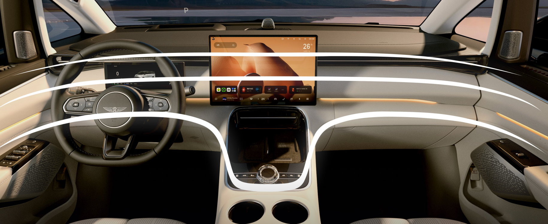 Inside, the cabin adopts a clean, modern layout centered on digital interfaces. It features a three-spoke multifunction steering wheel, a 10.25-inch fully digital instrument cluster, a 15.4-inch floating central touchscreen, and a large 19.8-inch AR head-up display, complemented by an electronic column-mounted shifter. The center console integrates wireless charging pads and cup holders, while retaining physical buttons for key functions.