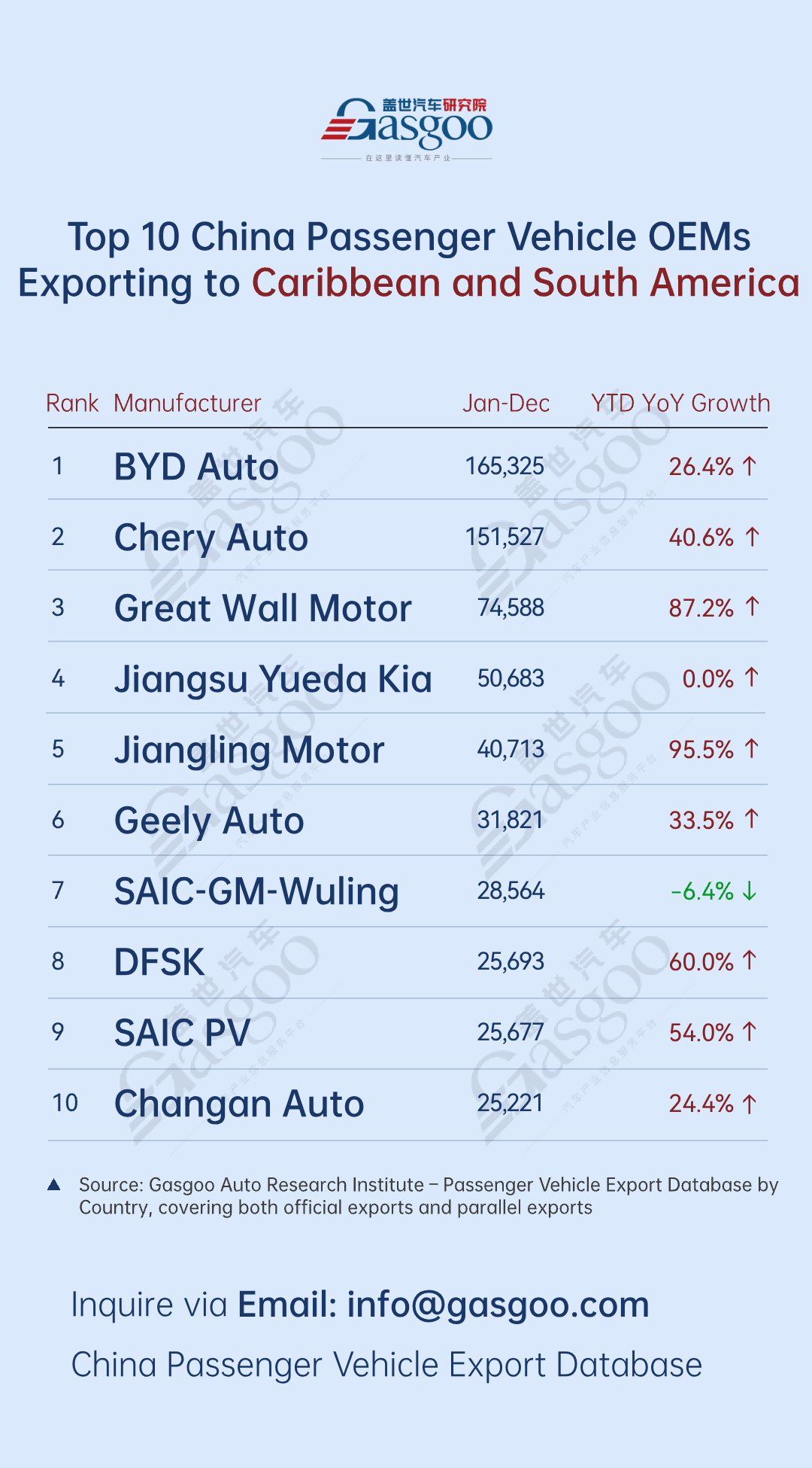 Top 10 Chinese automakers by passenger vehicle exports to Central and South America