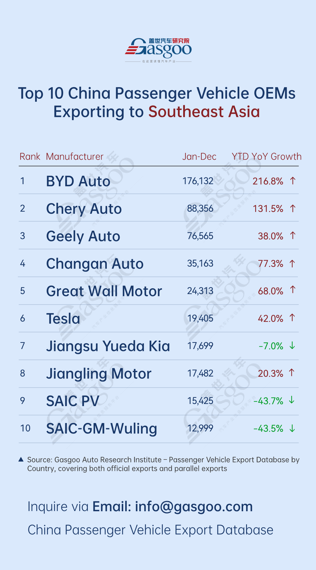 Top 10 Chinese automakers by passenger vehicle exports to Southeast Asia