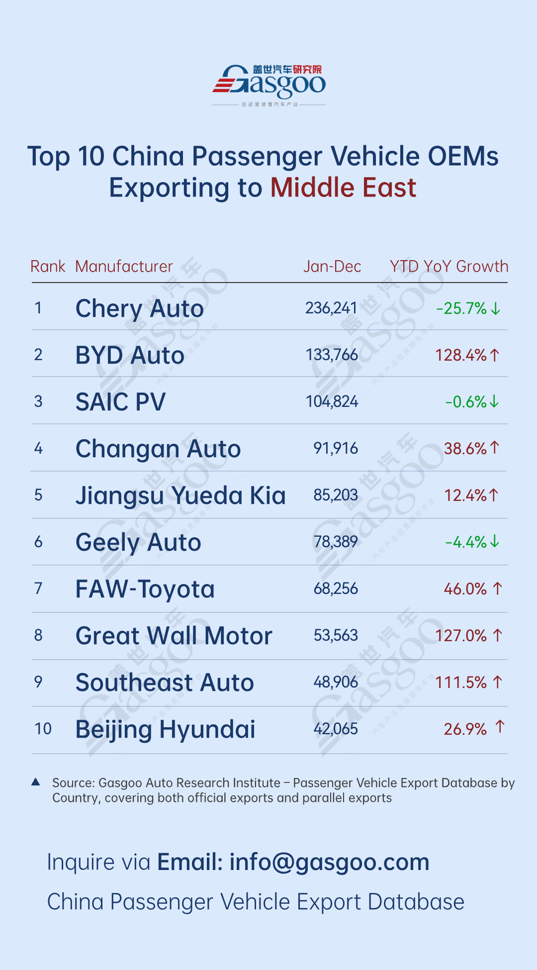 Top 10 Chinese automakers by passenger vehicle exports to Middle East