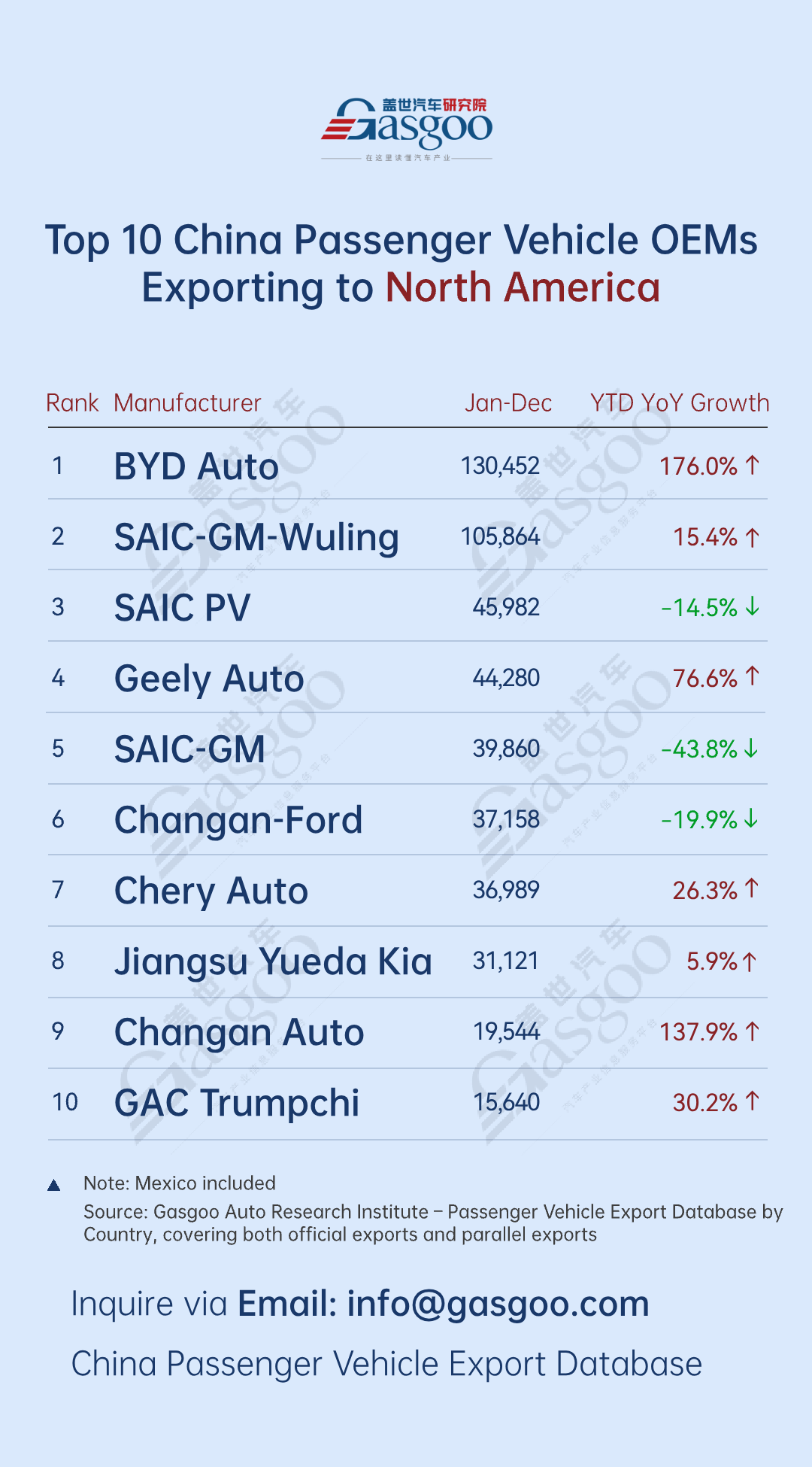 Top 10 Chinese automakers by passenger vehicle exports to North America