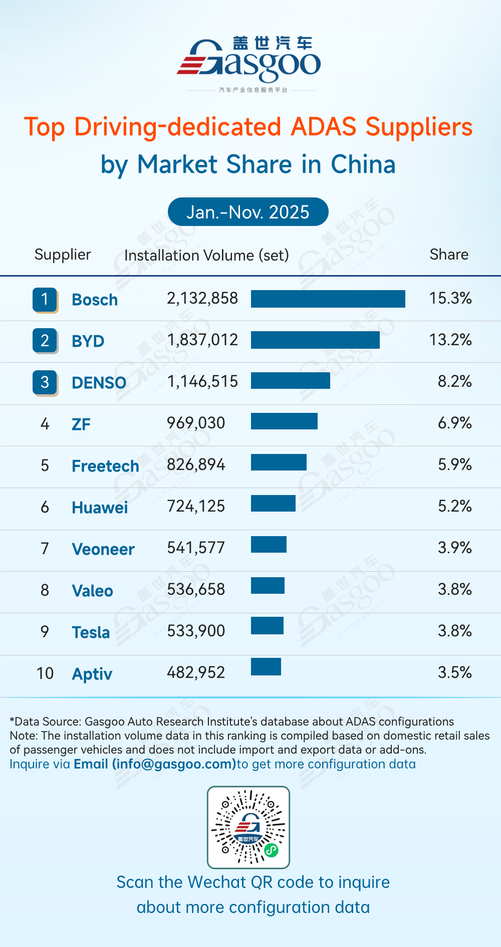 In the January–November 2025 Chinese driving-dedicated ADAS supplier market, the pattern is clear: "global Tier-1 leaders remain stable, while China's local challengers rise rapidly." Bosch led the pack with 2,132,858 units installed (15.3% market share, slightly down from 15.9% in January–October. BYD ranks second with a 13.2% share, becoming the top China's local supplier. Foreign suppliers (Bosch, Denso, ZF, etc.) still dominated the top 4 reflecting their strong technical foundation and supply chain advantages. At the same time, the presence of Chinese players such as FURETEX and Huawei, along with BYD's high ranking, indicated that Chinese ADAS suppliers—especially front-view integrated solutions—are gaining rapid recognition in both capacity and product competitiveness.