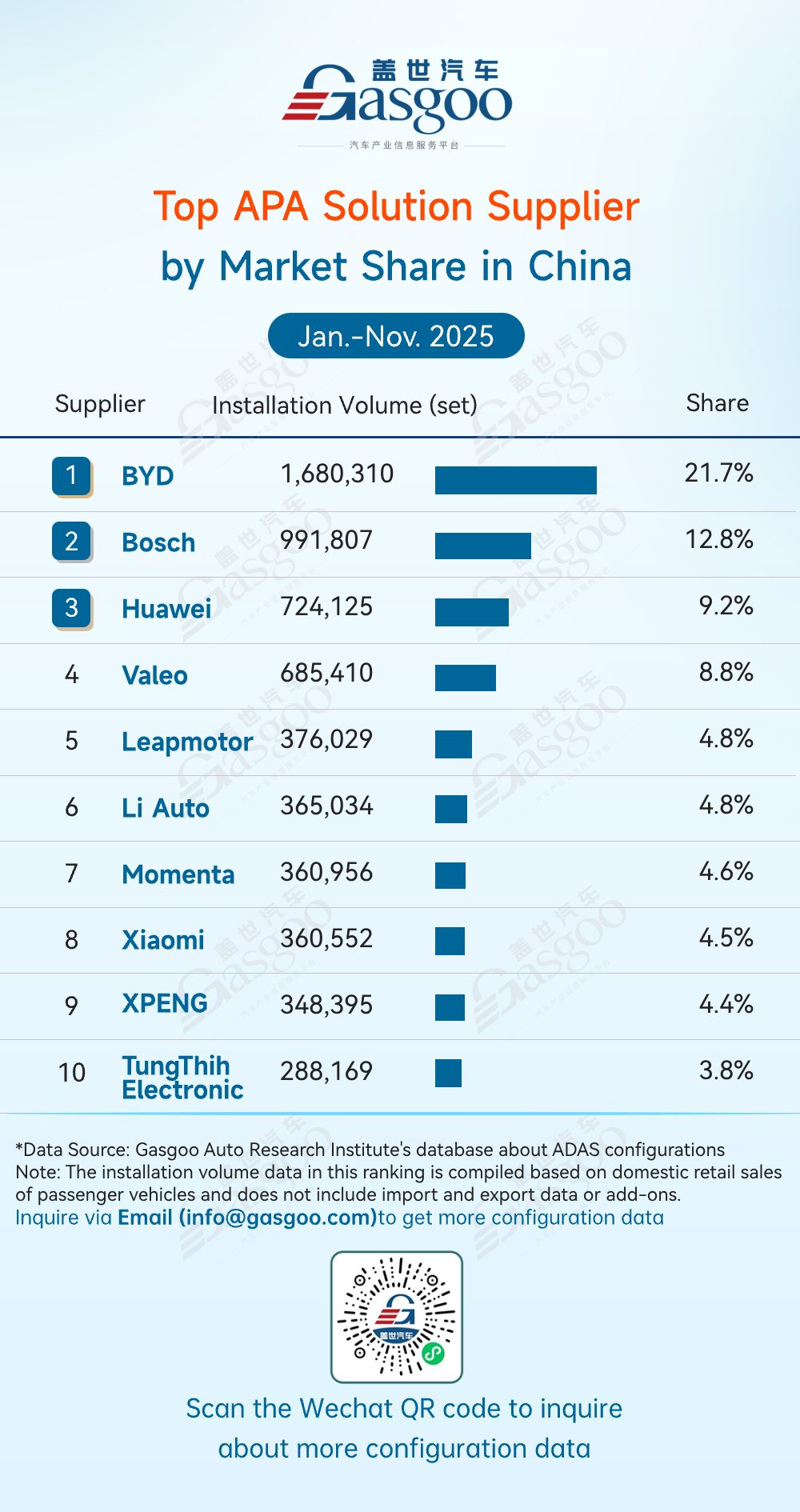 In Jan.–Nov. 2025, China's APA solution market is clearly dominated by local suppliers. BYD took the lead with 1,680,310 units (21.7% share), benefiting from deep integration between its APA system and vehicle lineup. Huawei and Momenta followed closely, competing with OEM self-developed solutions from Leapmotor and Li Auto. The most notable trend is the diversification of Chinese APA solutions: both in-house OEM systems and third-party platforms have achieved large-scale deployment, proving that China's local APA technology has matured in adaptability and user experience.