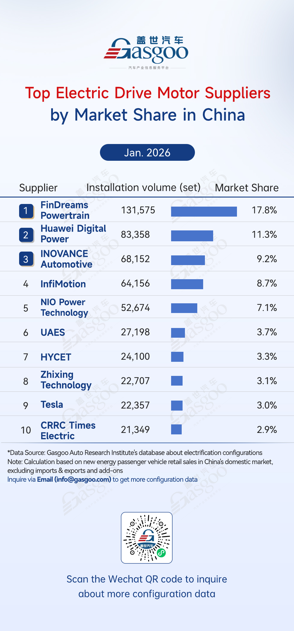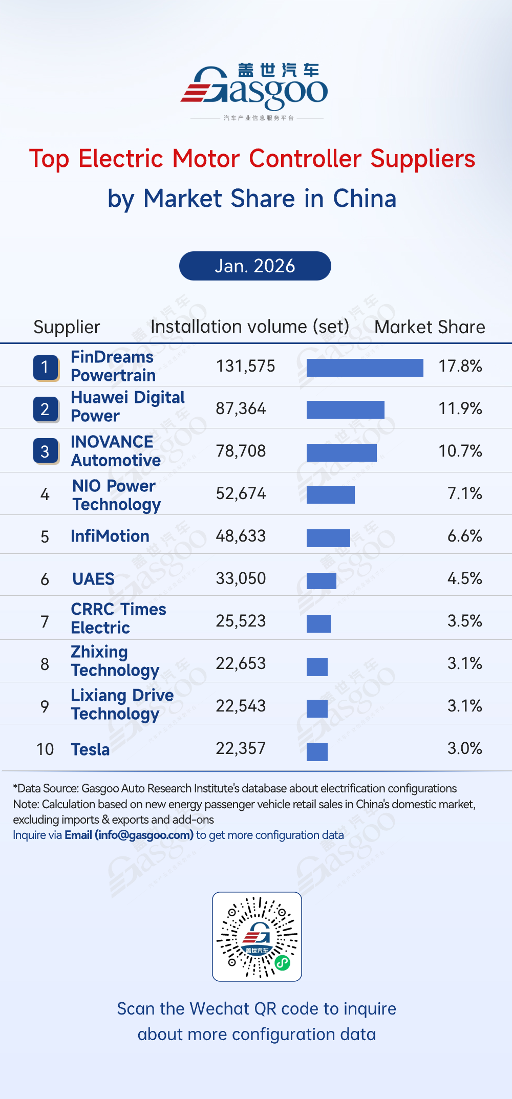 Based on motor controller installation data for January 2026, the market is led by OEM in-house suppliers, followed by strong third-party players, with in-house penetration continuing to accelerate and a clear concentration among leading players. FinDreams Powertrain ranked first with 131,575 sets (17.8% share), maintaining its advantage through deep integration with BYD's vehicle platforms. Leveraging full value chain vertical integration, it continues to strengthen its competitiveness in large-scale supply and cost control, further reinforcing its leadership in OEM in-house motor control systems.