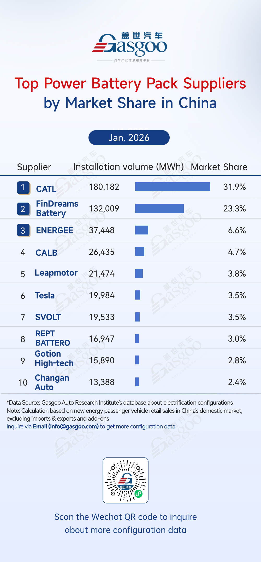 Based on battery pack installation data for January 2026, China's market landscape has shifted notably, with the top two suppliers accounting for over 55% of total share, forming a "dual-leader with tiered differentiation" pattern. CATL ranked first with 180,182 sets (31.9% share), surpassing FinDreams Battery, driven by its strengths in standardized pack products, technical adaptability, and scalable supply capabilities. FinDreams Battery followed with 132,009 sets (23.3% share), supported by BYD's vertically integrated model, which ensures stable in-house demand and sustained growth momentum.