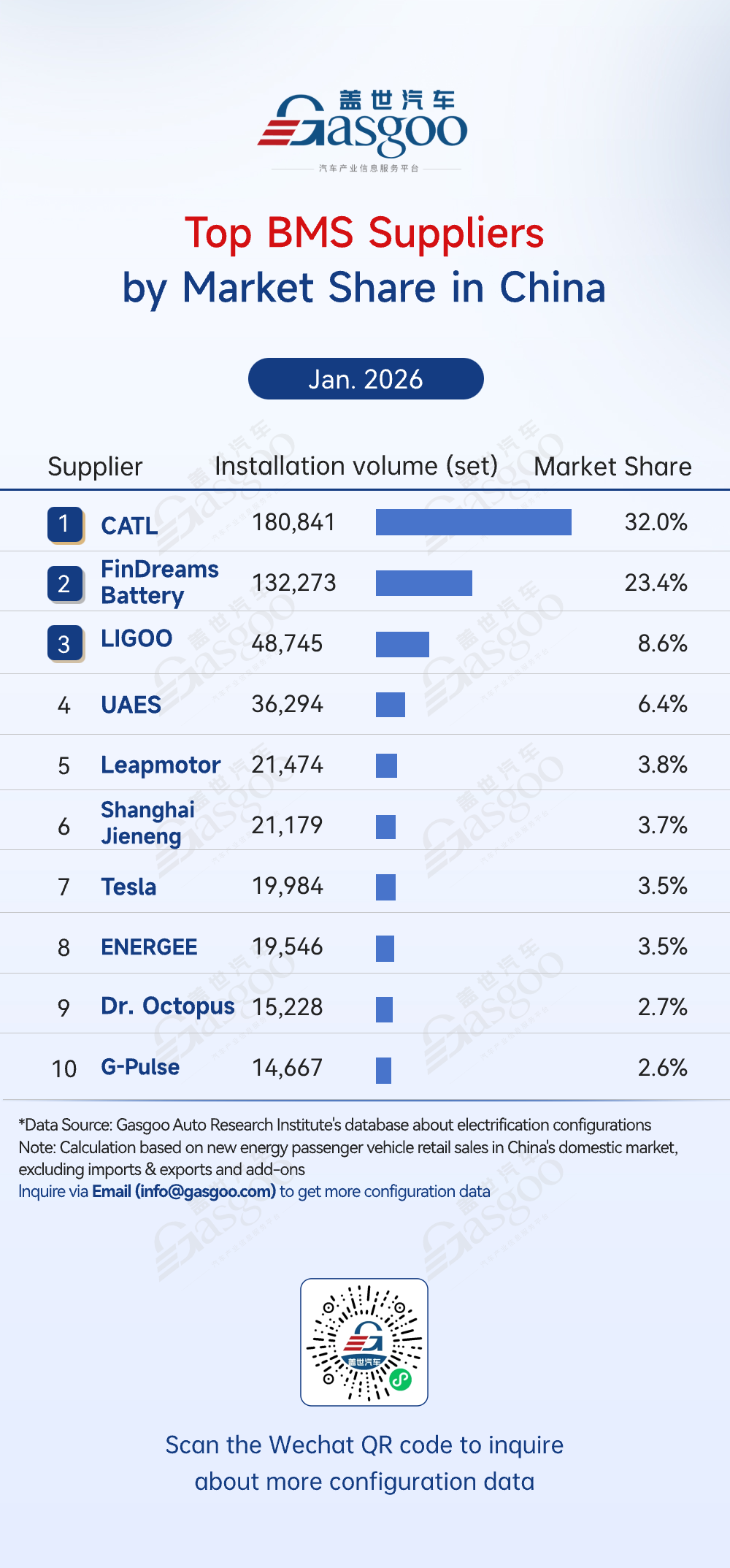 In January 2026, China's BMS market showed a clear pattern of "dual leaders, tiered differentiation, and accelerating OEM in-house development" CATL ranked first with 180,841 sets (32.0% share), leveraging its strong expertise in battery management technology and full value chain integration to achieve broad coverage across major automakers. FinDreams Battery followed with 132,273 sets (23.4% share), supported by BYD's vertically integrated model, with its in-house BMS deeply integrated into its vehicle lineup, sustaining strong organic growth momentum.
