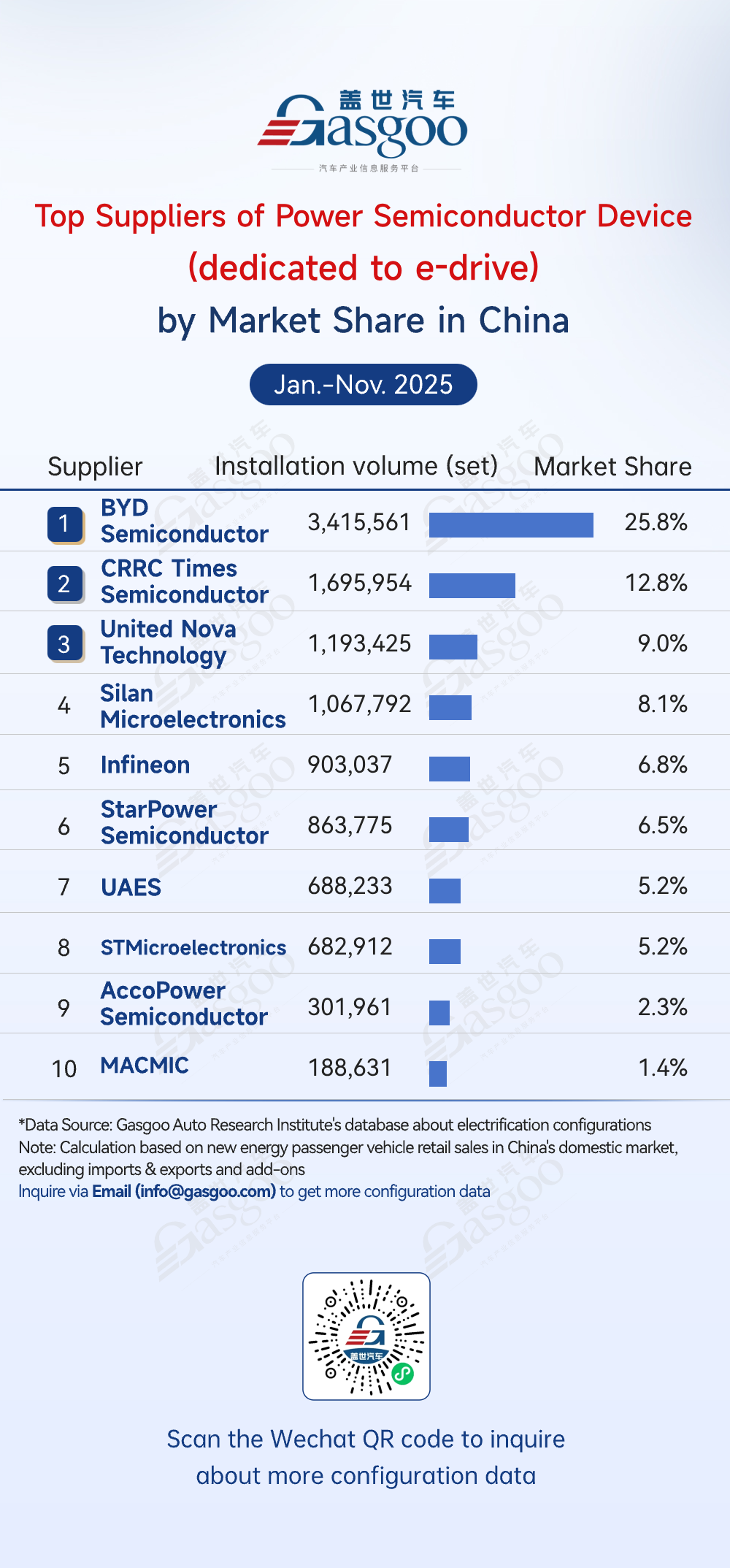 From January to November 2025, the power device (drive) market was dominated by domestic suppliers and highly concentrated at the top. BYD Semiconductor led with 3,415,561 sets installed and a 25.8% share, driven by deep integration with BYD's vehicle ecosystem. The top five suppliers together held 63% of the market, with four China's local companies (BYD Semiconductor, CRRC Times Semiconductor, ChipLink Integrated, and Silan Micro) in the top five, showing strong progress in domestic substitution. Foreign players Infineon and STMicroelectronics held 6.8% and 5.2%, respectively, trailing behind the leading domestic firms.