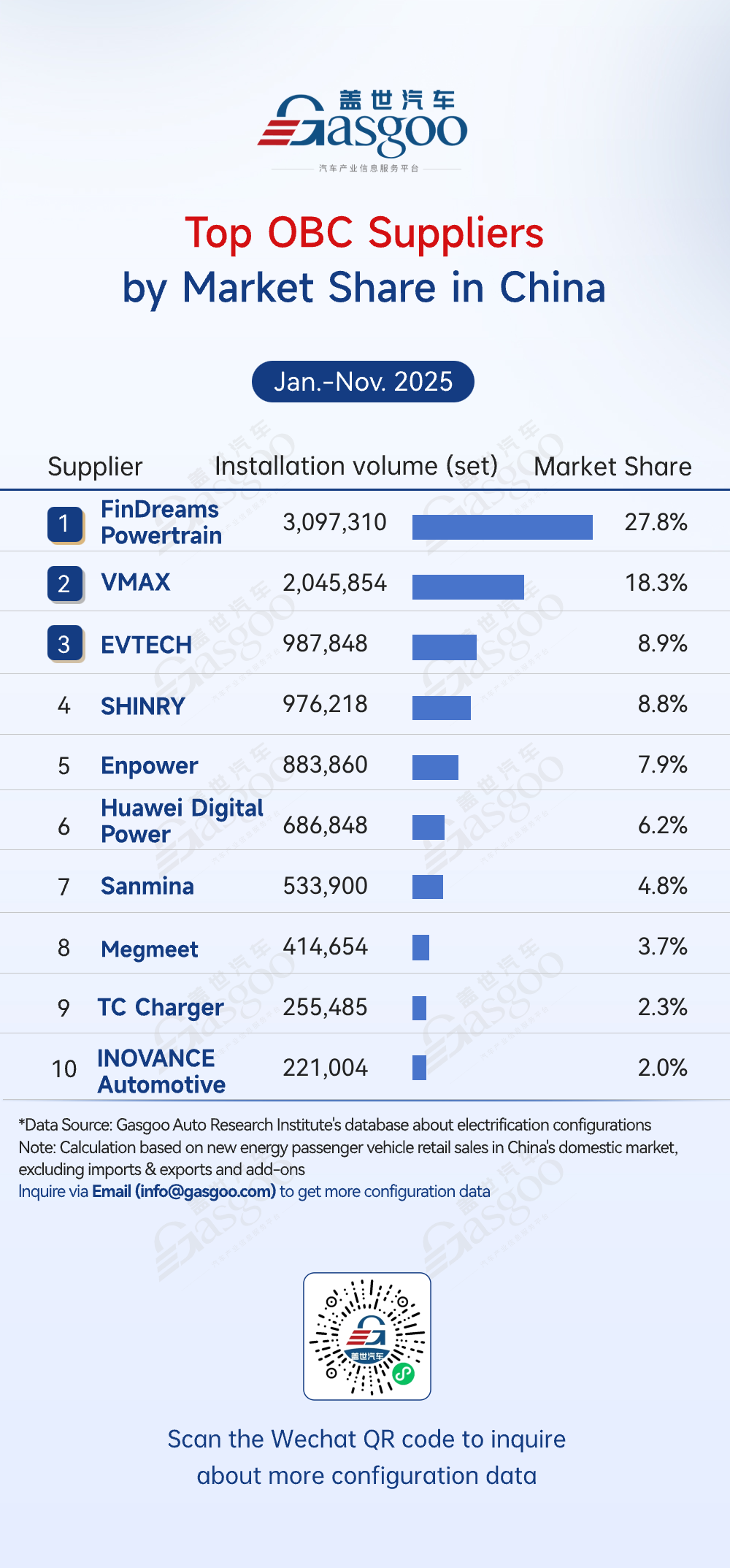 From January to November 2025, the OBC market showed a highly concentrated top tier, with the top five suppliers holding 72% of the market. FinDreams Powertrain led with 3.0973 million sets installed and a 27.8% share, followed by VMAX with 2.0459 million sets and 18.3%. Together, they formed the first tier. EVTECH, SHINRY, and Enpower formed the second tier, each holding 7%–9% market share. Their broad technical compatibility enabled them to serve multiple brands and act as key supplementary suppliers in the OBC ecosystem. Suppliers ranked sixth to tenth each held less than 6%, with shares gradually decreasing. The remaining market was split among various players, with smaller firms focusing on specific models or niche customers and relying on differentiated positioning to survive.