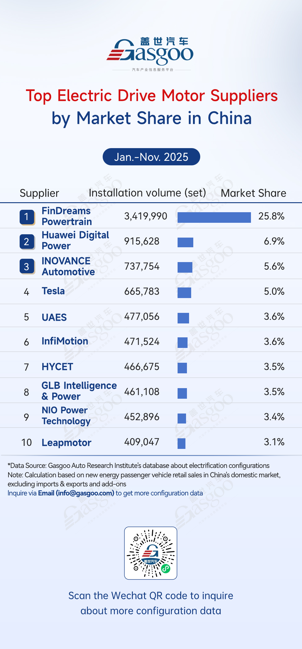 Based on data from the Gasgoo Automotive Research Institute, from January to November 2025, China's NEV passenger car electrification supply chain continued to show the characteristics of high concentration among leading players, solid dominance of domestic suppliers, and a deepening trend toward automaker self-control. Across key segments such as power batteries, battery PACKs, BMS, drive motors, and power devices, leading suppliers captured the core market share through comprehensive strengths. Among them, FinDreams-affiliated companies stood out, taking leading positions across multiple segments.