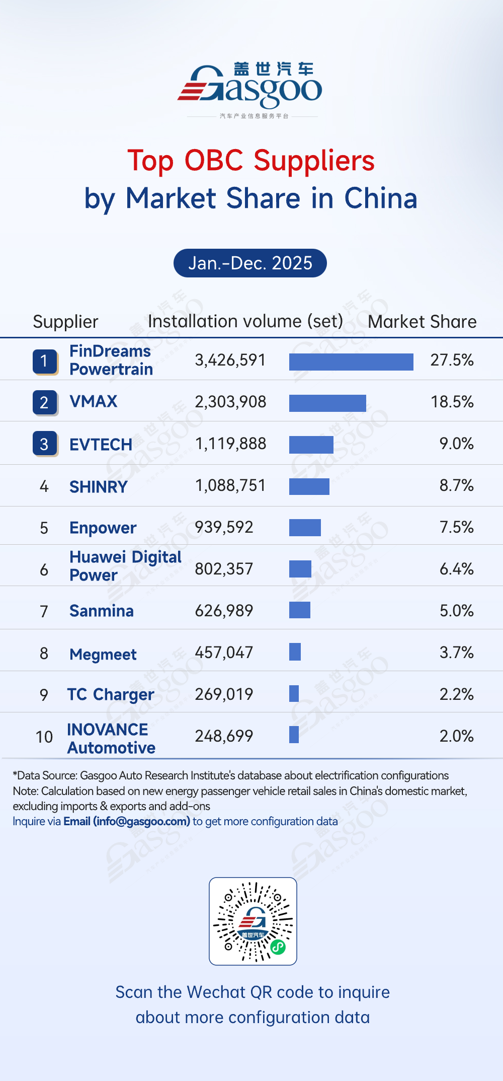 From January to December 2025, China's OBC market was highly concentrated, led by local players with clear technological differentiation. FinDreams Powertrain ranked first with 27.5% (3,426,591 sets), benefiting from BYD's vertically integrated supply chain and deep model-specific adaptation. VMAX followed with 18.5%, providing mature third-party solutions to multiple mainstream automakers. The top 5 suppliers together accounted for over 70%, reflecting accelerating market concentration, while companies like EVTECH and SHINRY Technology steadily grew in niche segments, demonstrating local supply chain strengths in technology and capacity.