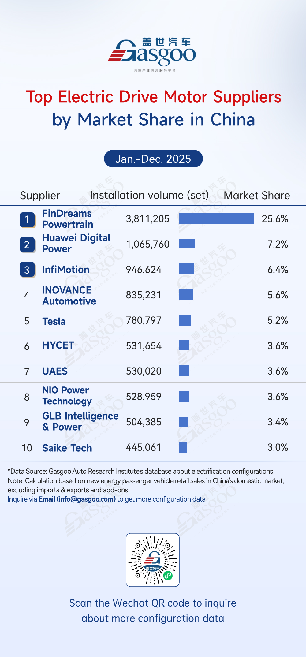 From January to December 2025, China's electric drive motor market was led by FinDreams Powertrain, Huawei Digital Power, and InfiMotion. FinDreams Powertrain held 25.6% (3,811,205 sets), benefiting from BYD's vertical integration and strong scale advantages. Huawei, InfiMotion, and INOVANCE Automotive expanded through motor efficiency and system integration expertise. Tesla and NIO Power Technology's in-house systems also ranked high, highlighting differentiated competition and driving industry upgrades.