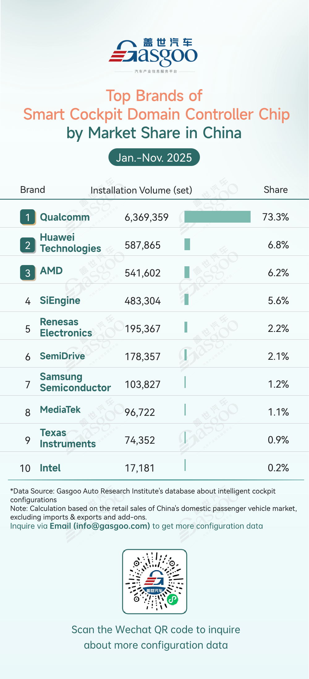 Overall, Qualcomm's leading position is likely to remain stable in the short term. However, rapid technological progress and faster market penetration by domestic chips are accelerating the localization of cockpit domain controller chips. As China's local manufacturers continue to strengthen their performance and cost competitiveness, the market is expected to move away from a single dominant player. The industry will evolve through multi-party competition toward smarter solutions that better meet China's local cockpit requirements.