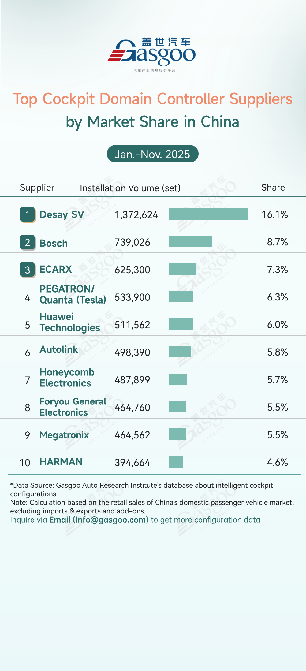 From January to November, cockpit domain controller market penetration accelerated, and under the trend of integration, domestic suppliers continued to consolidate their leading position. Desay SV led the pack strongly with over 1.37 million sets installed (16.1% share), further widening its lead. Bosch followed with an 8.7% share, and together the two formed the market's first tier.