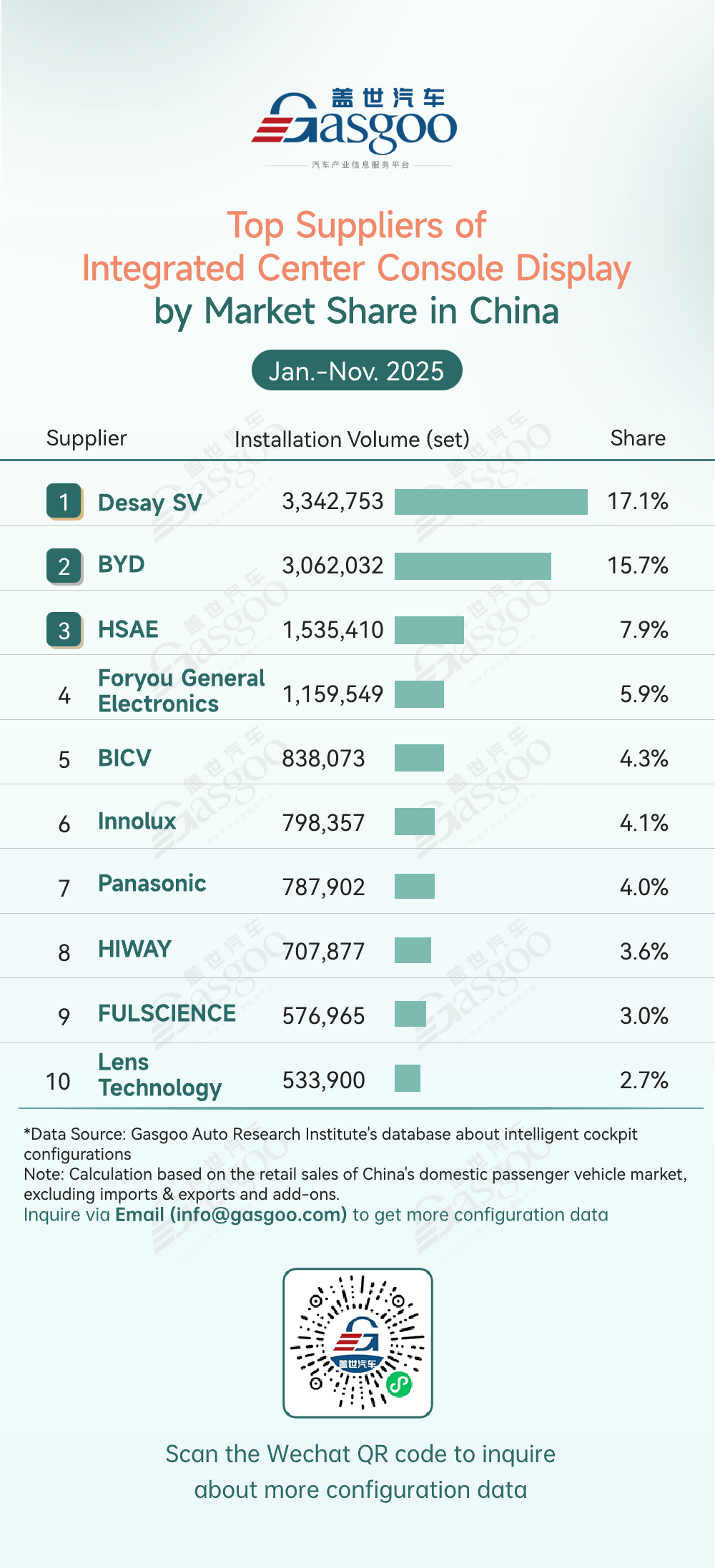 From January to November, the dominance of domestic suppliers in the central control screen market became increasingly clear. Desay SV led the pack with 3,342,753 sets installed (17.1% market share), maintaining a strong leading position. BYD followed closely with 3,062,032 sets (15.7% share), leveraging its vehicle ecosystem synergy. Together, the two accounted for over 32% of the market, forming the "top domestic duo" in central control screen integration.