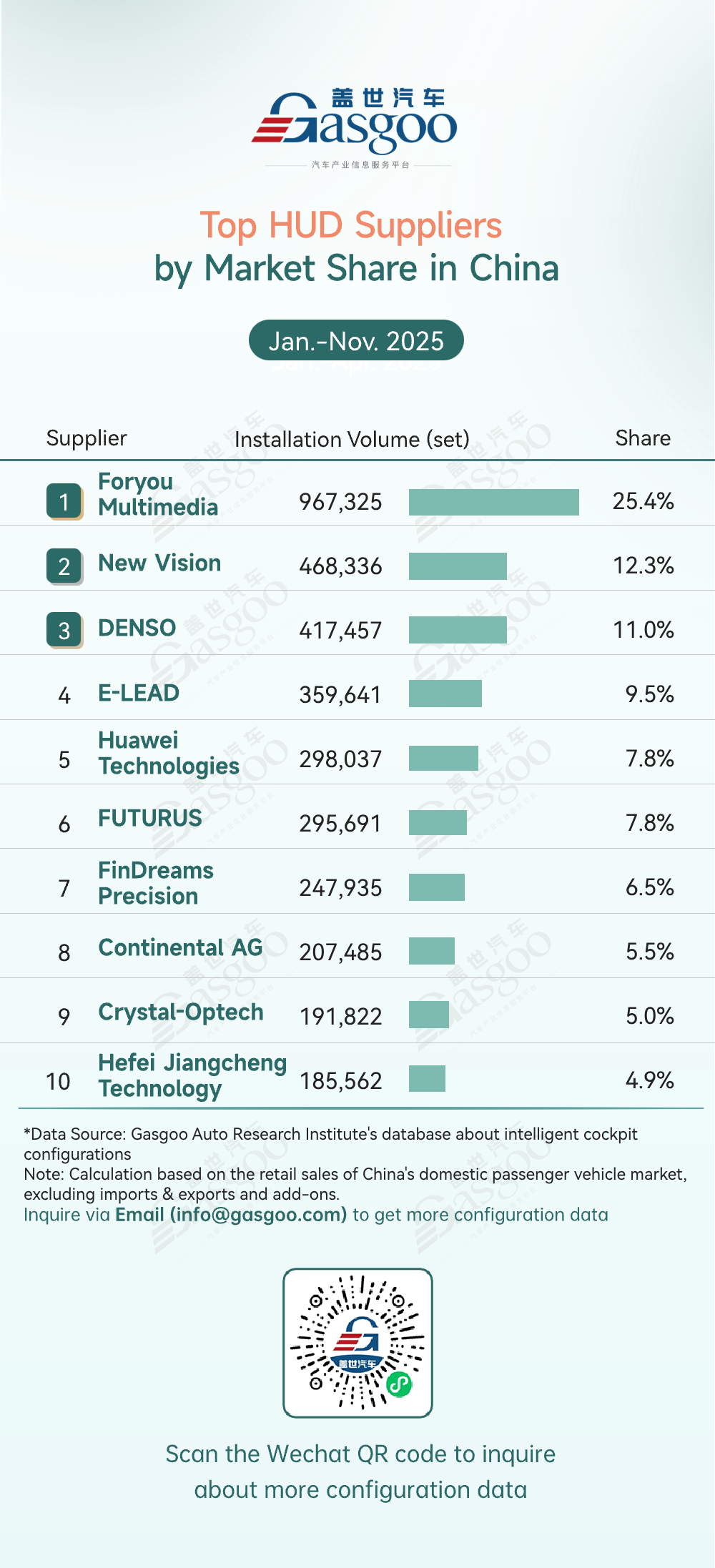 From January to November, the HUD market continued to expand as in-vehicle displays became more widely adopted, showing a pattern of domestic leadership and diverse competition. Foryou Multimedia led strongly with 967,325 sets installed (25.4% share), further strengthening its advantage. New Vision and DENSO followed with 12.3% and 11.0% shares respectively, making competition within the top tier increasingly intense. E-LEAD ranked in the mid-tier with a 9.5% share, while Huawei Technologies and FUTURUS were tied. China's local players such as FinDreams Precision competed alongside traditional international Tier 1 suppliers like Continental AG, highlighting the diverse mix of participants in the HUD track.