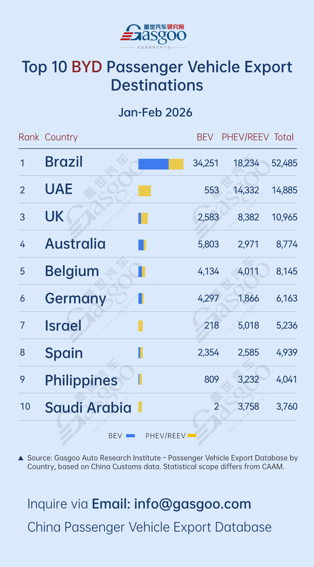 Here are the top 10 destination countries by BYD passenger vehicle exports from January to February 2026, with detailed data: