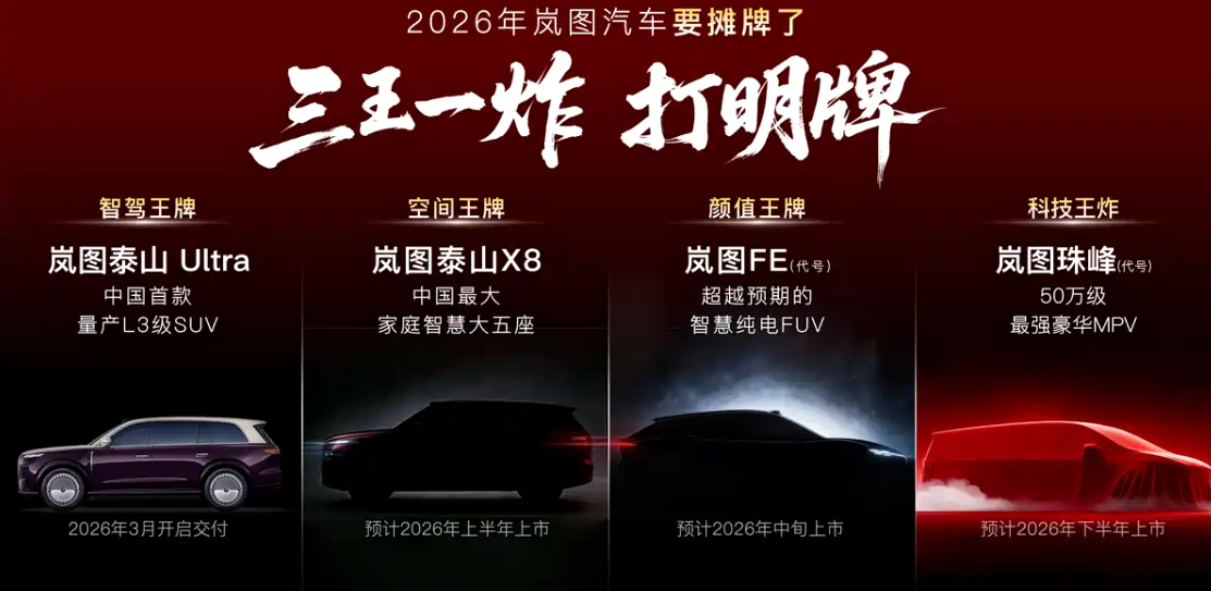 According to the plan, the four models include the VOYAH Titan Ultra, positioned as China's first mass-produced L3-capable SUV; the VOYAH Titan X8, described by the company as a "courtyard-sized" five-seat family SUV; a brand-new pure-electric FUV currently known by the internal codename "FE"; and a flagship MPV project codenamed "Everest."